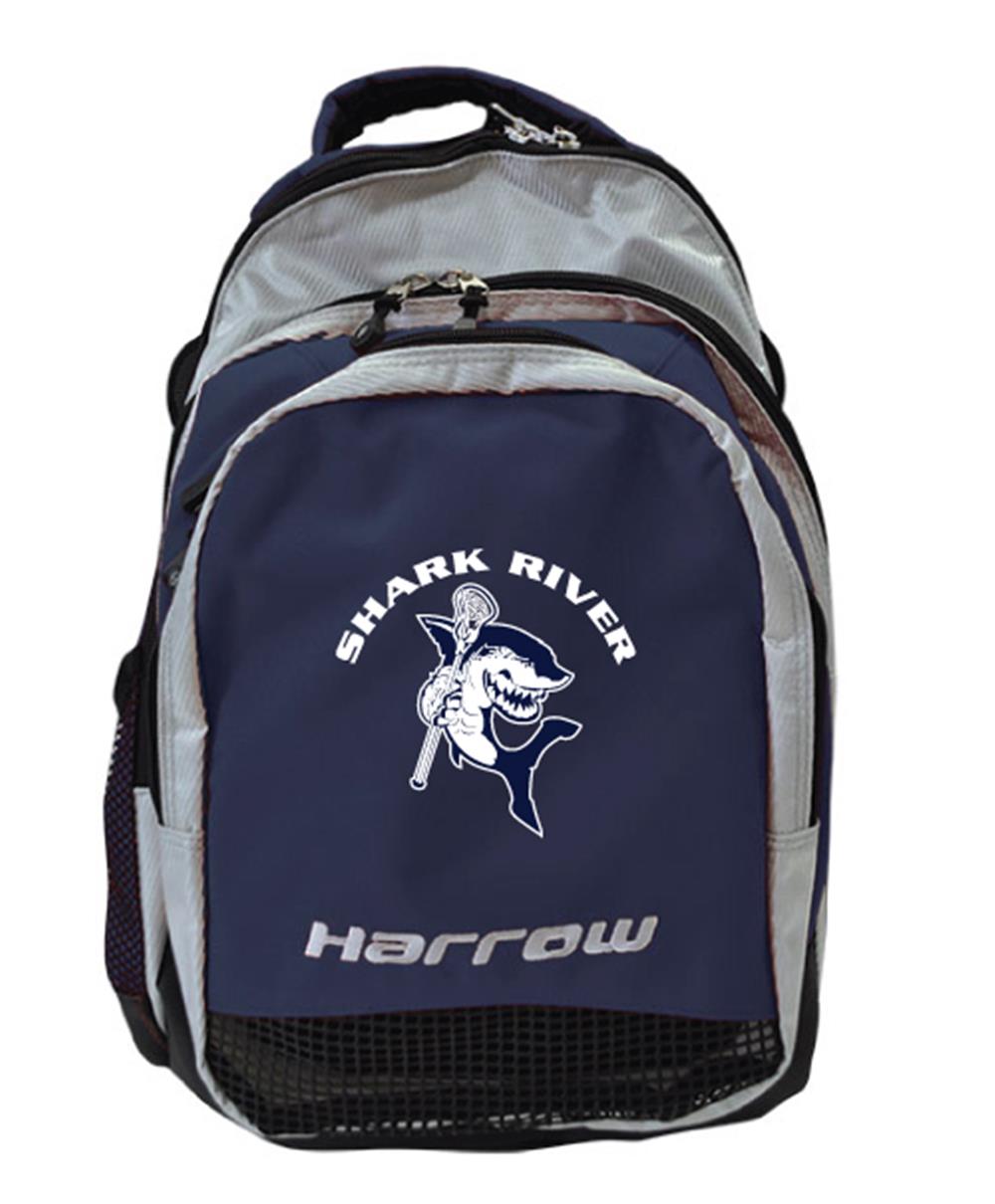Harrow Elite Backpack in navy/silver with custom embroidered logo. With three large zipper compartments and a cushioned mesh backing allows you to comfortably store all of your gear. A stick holder on each side allows you to be hands free and carry your field hockey or lacrosse sticks.